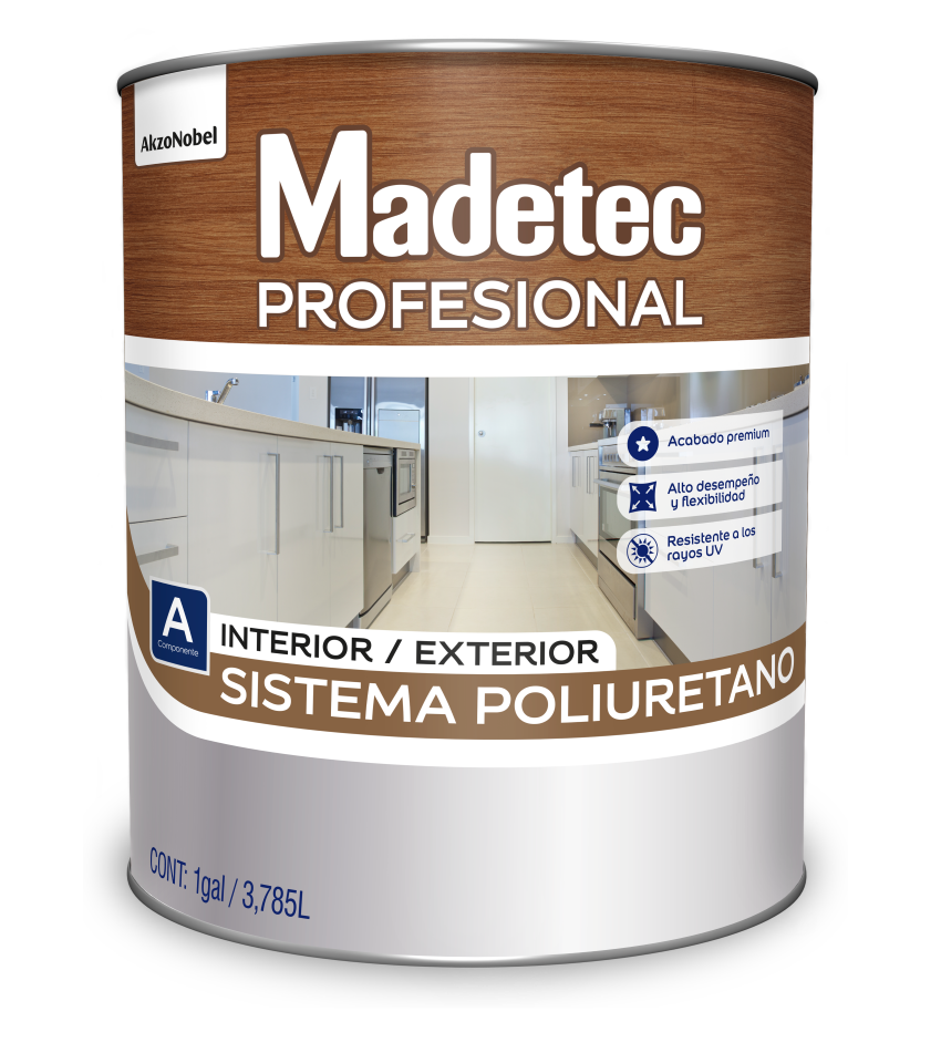 Madetec Barniz Poliuretano es un barniz a base de resinas de uretano modificado de rápido secado, que permiten obtener una película de mucho mayor resistencia y protección que los barnices alquídicos, en superficies interiores y exteriores. Posee un acabado de alto brillo y deja una de alta dureza. Ideal para pisos y superficies de madera en zonas de alto tránsito.